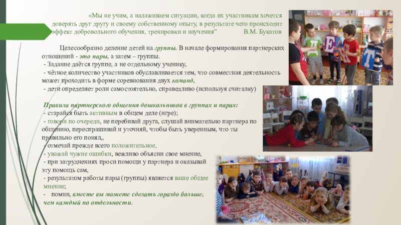 Целесообразно деление детей на группы. В начале формирования партнерских отношений - это пары, а затем – группы.