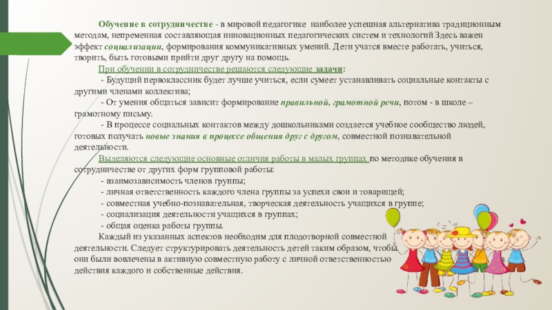 методам, непременная составляющая инновационных педагогических систем и технологий Здесь важен эффект социализации, формирования коммуникативных умений. Дети учатся вместе работать, учиться, творить, быть готовыми прийти друг другу на помощь.