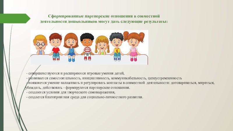 Сформированные партнерские отношения в совместной деятельности дошкольников могут дать следующие результаты: