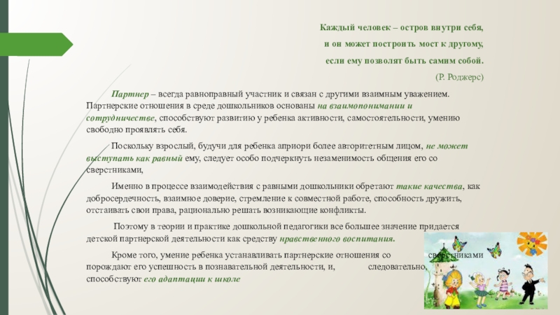 Партнер – всегда равноправный участник и связан с другими взаимным уважением. Партнерские отношения в среде дошкольников основаны на взаимопонимании и сотрудничестве, способствуют развитию у ребенка активности, самостоятельности, умению свободно проявлять себя.