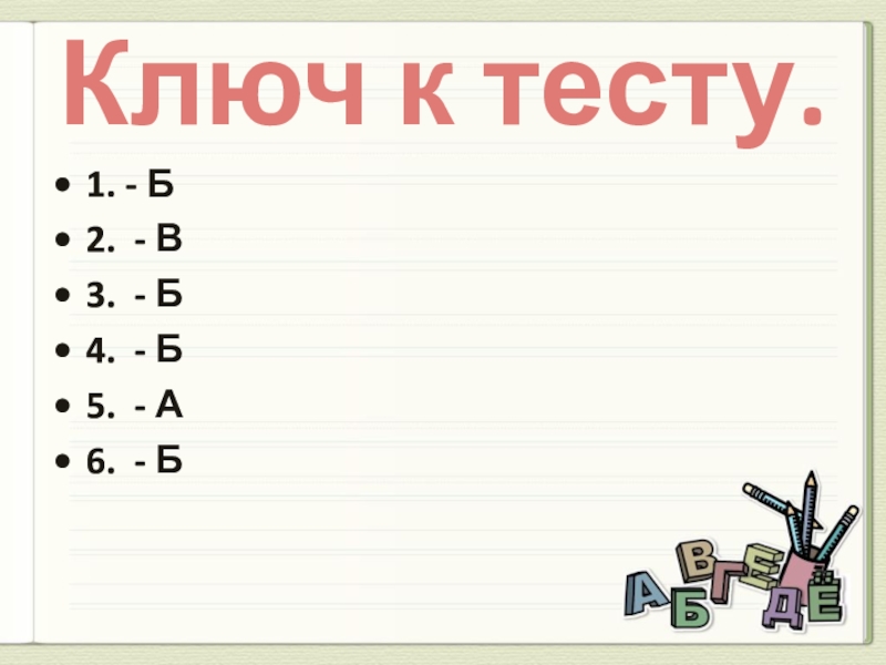 Ключ к тесту.1. - Б 2. - В3. - Б4. - Б5. - А6. - Б