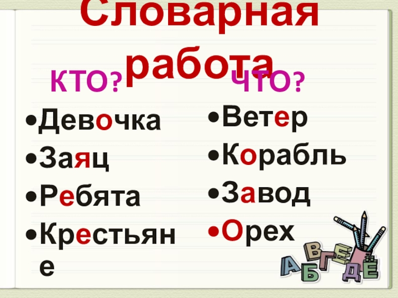 Словарная работаДевочкаЗаяцРебятаКрестьянеВетерКорабльЗаводОрехКТО?ЧТО?