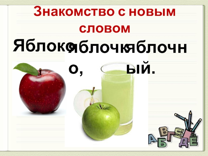 Знакомство с новым словомЯблоко,яблочко,яблочный.