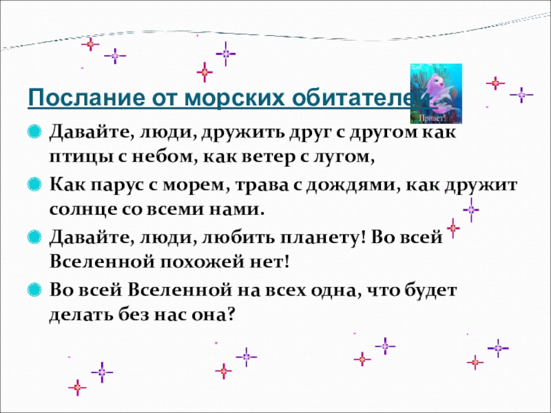 Это сайт презентаций, где можно хранить и обмениваться своими презентациями, докладами, проектами, шаблонами в формате PowerPoint с другими пользователями. Мы помогаем школьникам, студентам, учителям, преподавателям хранить и обмениваться учебными материалами.