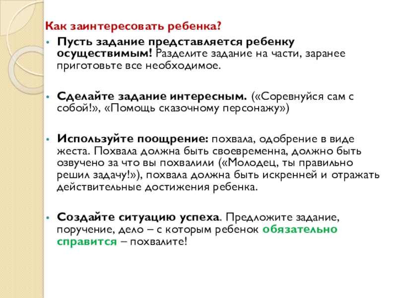 Пусть задание представляется ребенку осуществимым! Разделите задание на части,