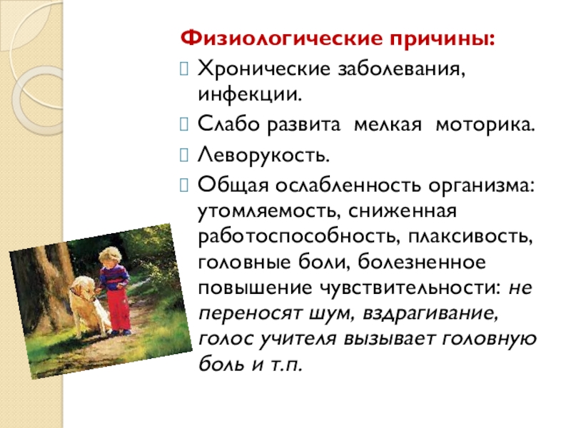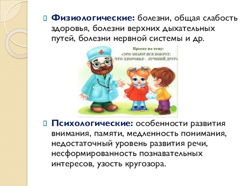 Слайд 3Физиологические: болезни, общая слабость здоровья, болезни верхних дыхательных путей, болезни нервной