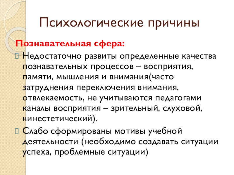 Психологические: особенности развития внимания, памяти, медленность понимания, недостаточный уровень развития речи, несформированность познавательных интересов, узость кругозора.