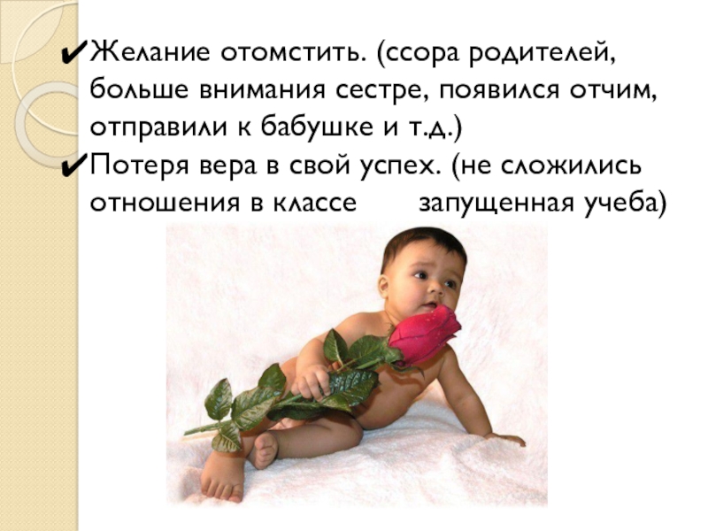Слайд 8Желание отомстить. (ссора родителей, больше внимания сестре, появился отчим, отправили к