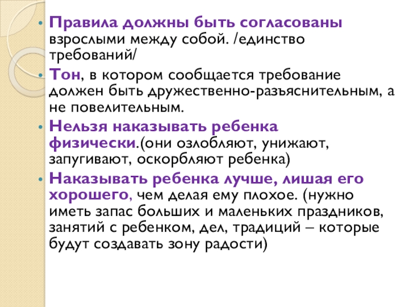 Слайд 13Правила должны быть согласованы взрослыми между собой. /единство требований/