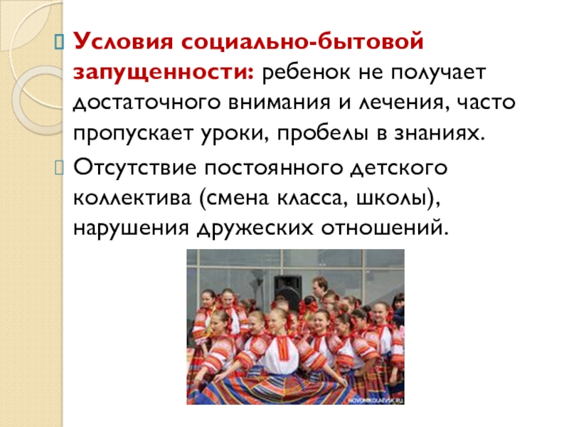 Слайд 9Условия социально-бытовой запущенности: ребенок не получает достаточного внимания и лечения, часто