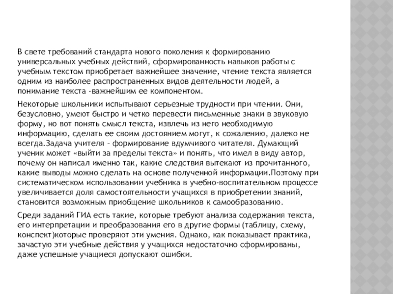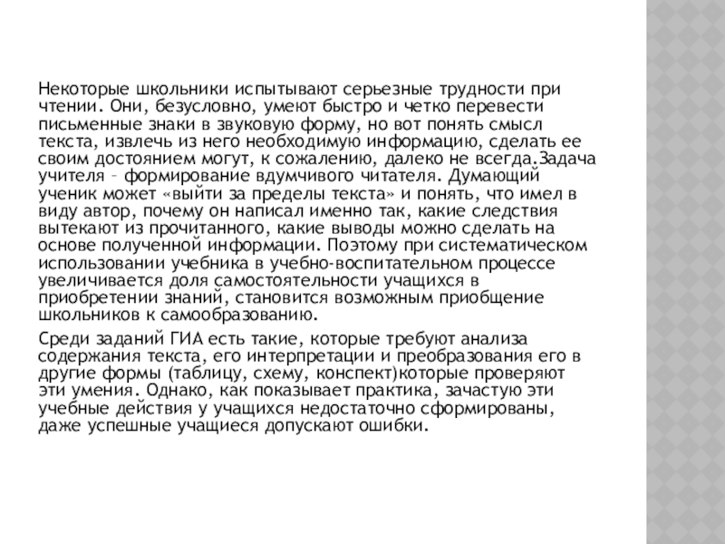Некоторые школьники испытывают серьезные трудности при чтении. Они, безусловно, умеют быстро и четко перевести письменные знаки в звуковую форму, но вот понять смысл текста, извлечь из него необходимую информацию, сделать ее своим достоянием могут, к сожалению, далеко не всегда.Задача учителя – формирование вдумчивого читателя. Думающий ученик может «выйти за пределы текста» и понять, что имел в виду автор, почему он написал именно так, какие следствия вытекают из прочитанного, какие выводы можно сделать на основе полученной информации.Поэтому при систематическом использовании учебника в учебно-воспитательном процессе увеличивается доля самостоятельности учащихся в приобретении знаний, становится возможным приобщение школьников к самообразованию.