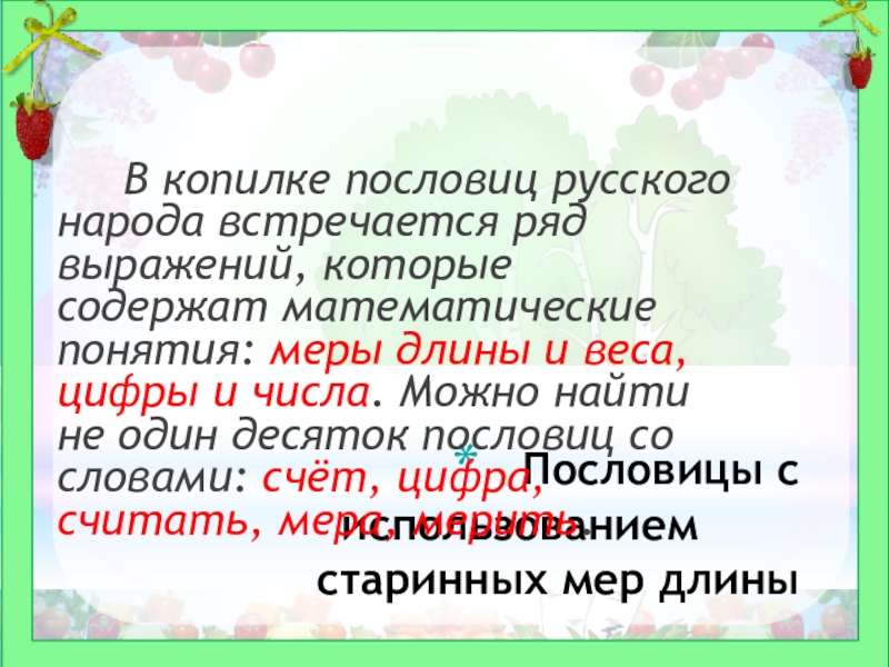 В копилке пословиц русского народа встречается ряд выражений, которые содержат математические понятия: меры длины и веса, цифры и числа. Можно найти не один десяток пословиц со словами: счёт, цифра, считать, мера, мерить.