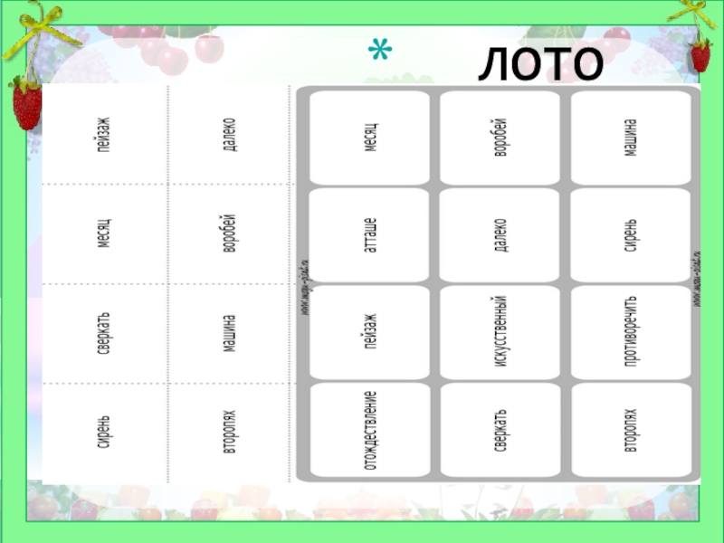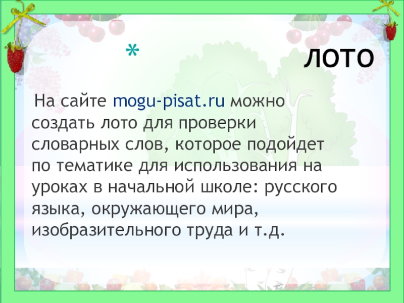 На сайте mogu-pisat.ru можно создать лото для проверки словарных слов, которое подойдет по тематике для использования на уроках в начальной школе: русского языка, окружающего мира, изобразительного труда и т.д.