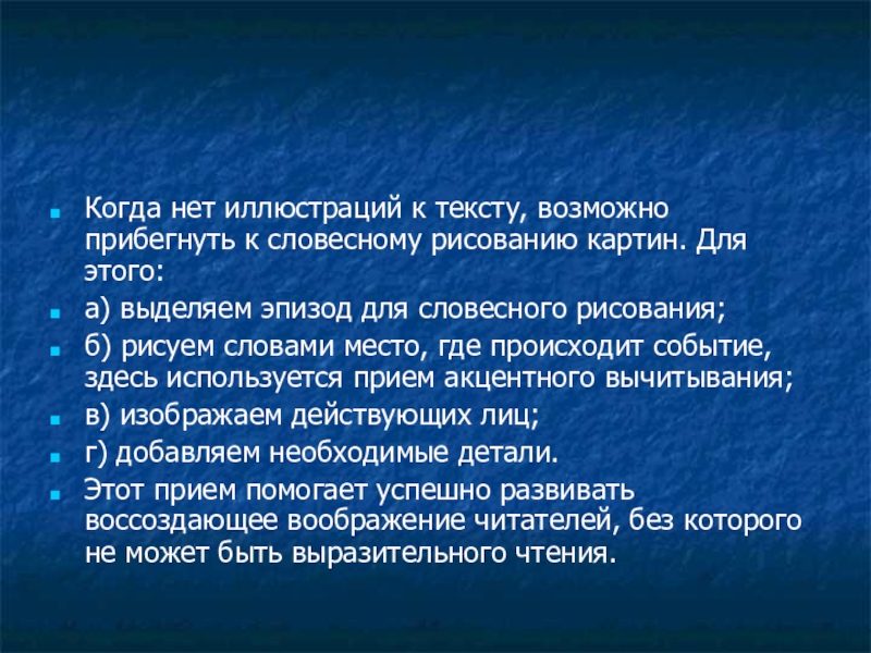 Этот прием помогает успешно развивать воссоздающее воображение читателей, без которого не может быть выразительного чтения.