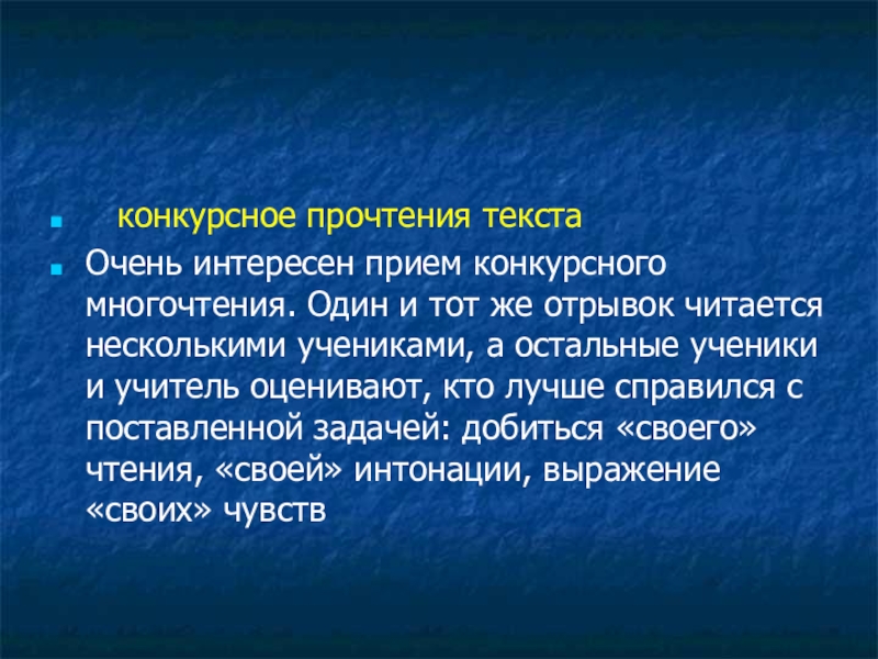 тот же отрывок читается несколькими учениками, а остальные ученики и учитель оценивают, кто лучше справился с поставленной задачей: добиться «своего» чтения, «своей» интонации, выражение «своих» чувств