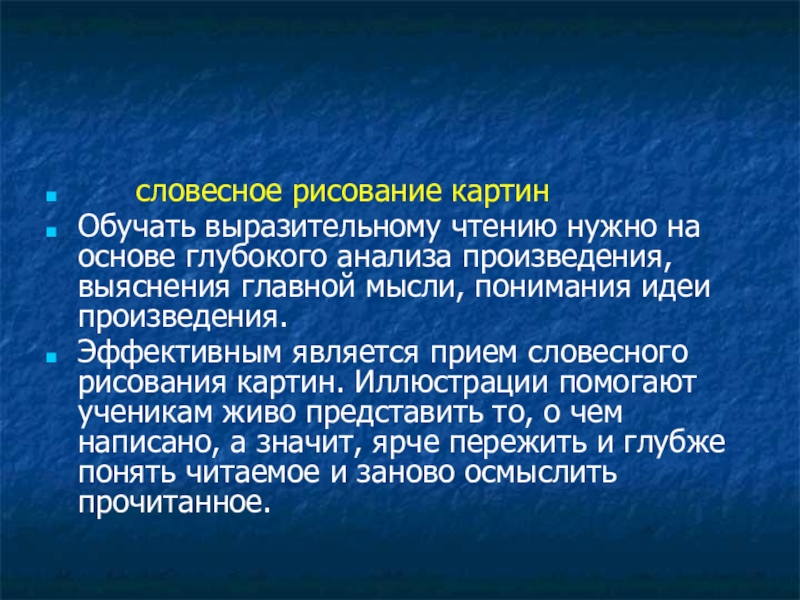 Эффективным является прием словесного рисования картин. Иллюстрации помогают ученикам живо представить то, о чем написано, а значит, ярче пережить и глубже понять читаемое и заново осмыслить прочитанное.