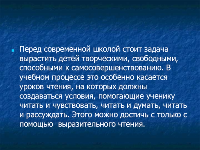 самосовершенствованию. В учебном процессе это особенно касается уроков чтения, на которых должны создаваться условия, помогающие ученику читать и чувствовать, читать и думать, читать и рассуждать. Этого можно достичь с только с помощью выразительного чтения.