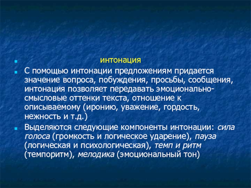 Выделяются следующие компоненты интонации: сила голоса (громкость и логическое ударение), пауза (логическая и психологическая), темп и ритм (темпоритм), мелодика (эмоциональный тон)