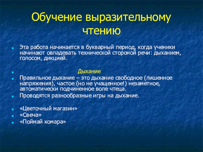 Правильное дыхание – это дыхание свободное (лишенное напряжения), частое (но не учащенное!) незаметное, автоматически подчиненное воле чтеца.