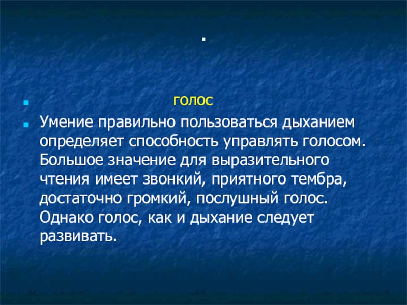Умение правильно пользоваться дыханием определяет способность управлять голосом. Большое значение для выразительного чтения имеет звонкий, приятного тембра, достаточно громкий, послушный голос. Однако голос, как и дыхание следует развивать.
