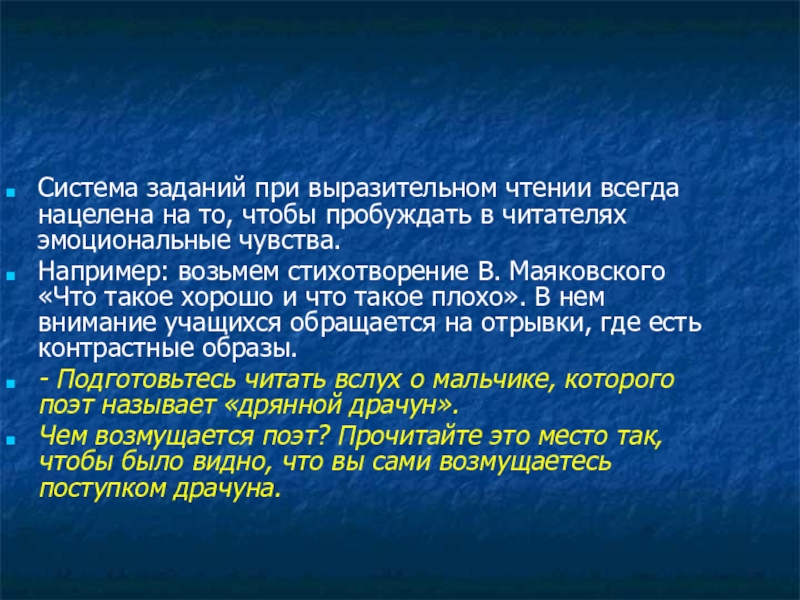Слайд 11Система заданий при выразительном чтении всегда нацелена на то, чтобы пробуждать