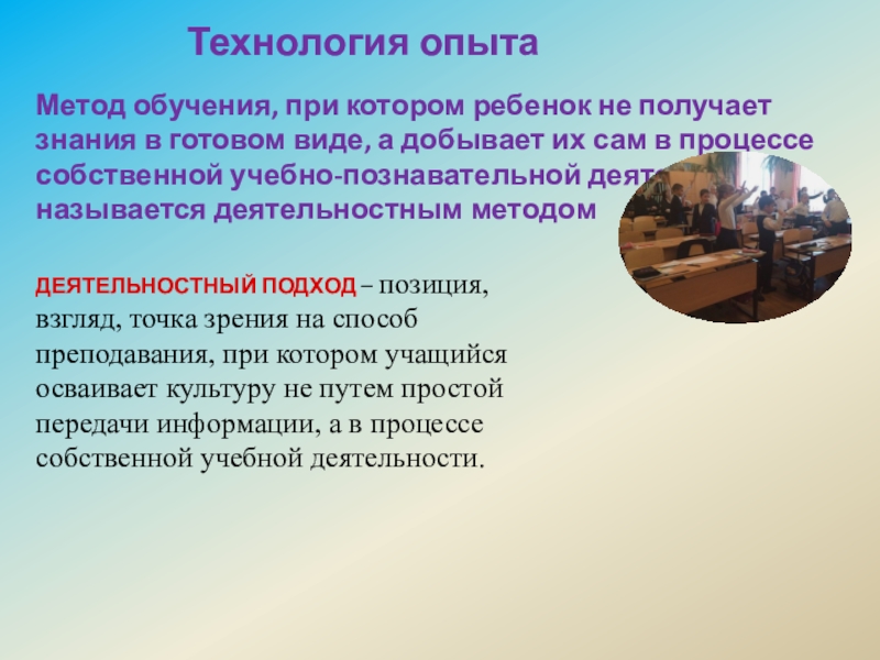 ДЕЯТЕЛЬНОСТНЫЙ ПОДХОД − позиция, взгляд, точка зрения на способ преподавания, при котором учащийся осваивает культуру не путем простой передачи информации, а в процессе собственной учебной деятельности.