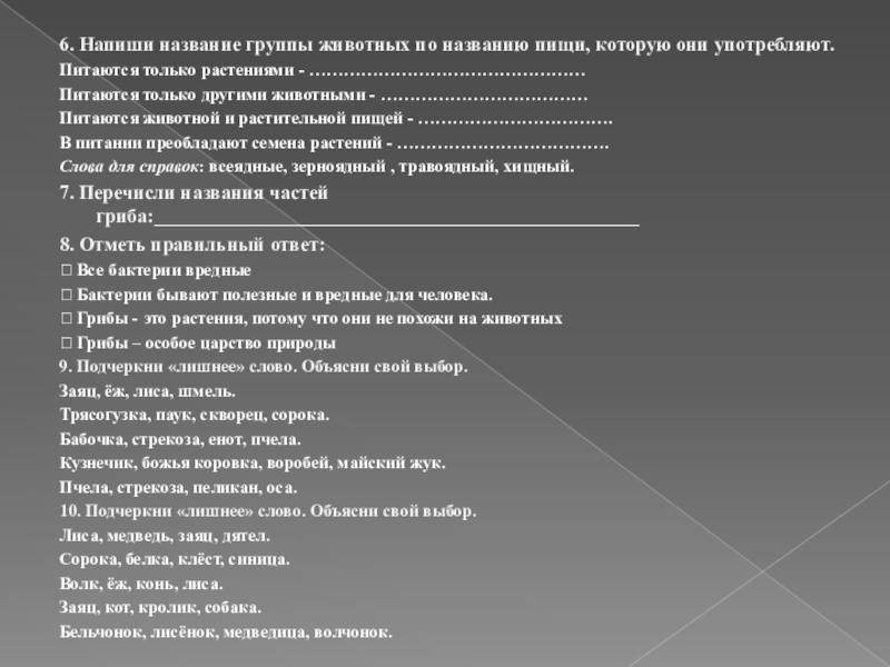 Слайд 76. Напиши название группы животных по названию пищи, которую они употребляют.