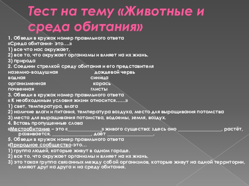 Слайд 12Тест на тему «Животные и среда обитания»