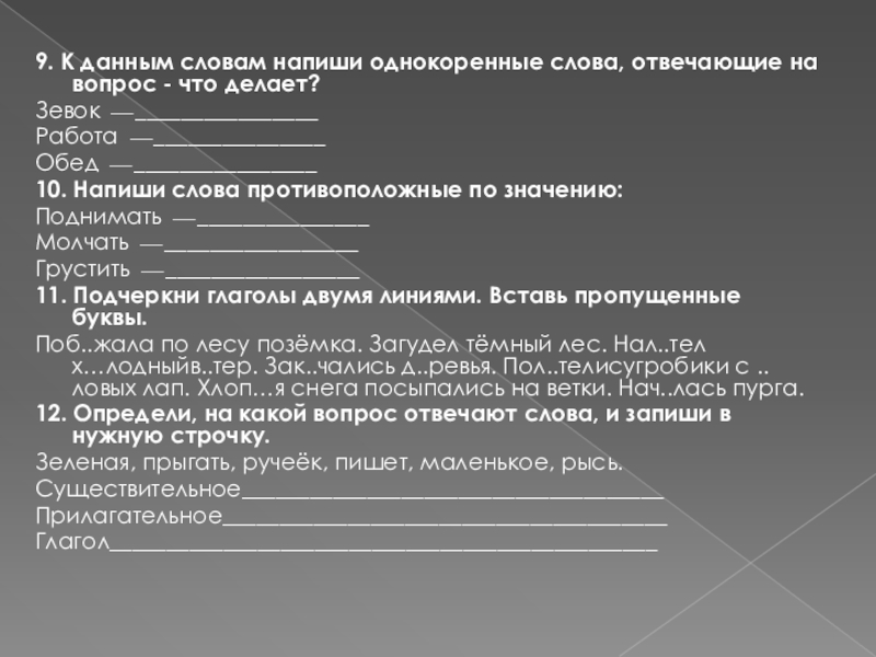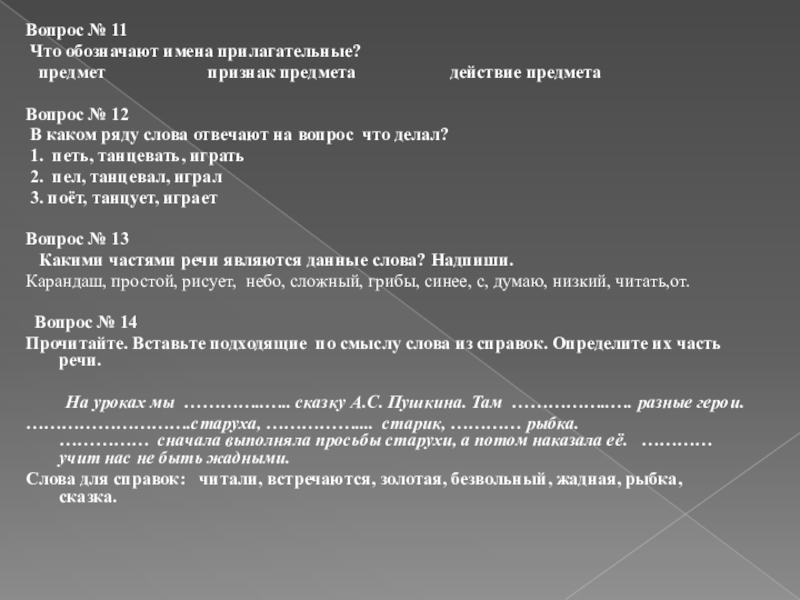 а) Какой? Какая? Какое? Какие? б) Что делать? Что сделать? в) Кто? Что?