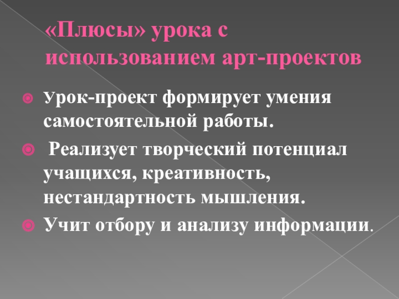 Слайд 42«Плюсы» урока с использованием арт-проектов