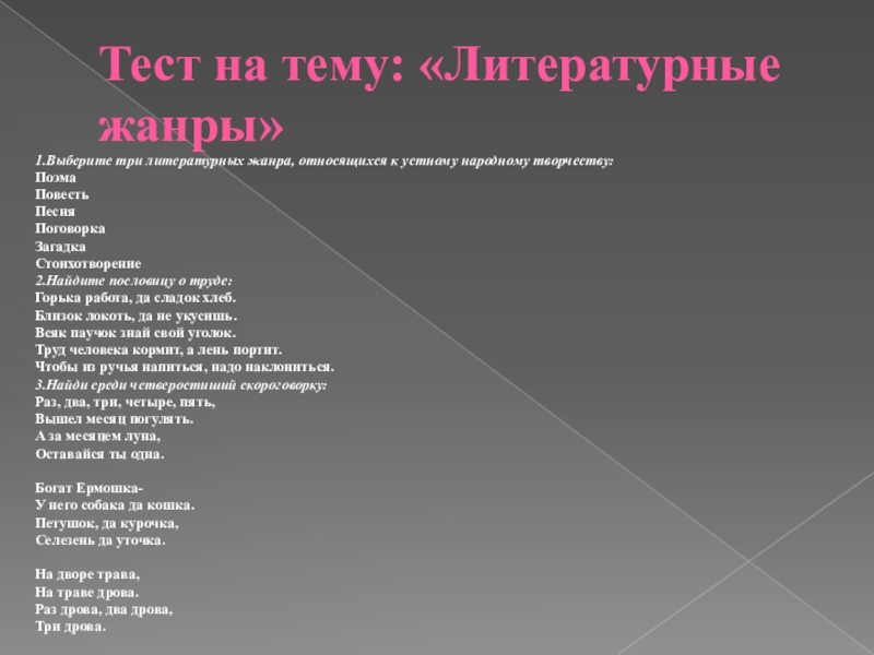 Слайд 33Тест на тему: «Литературные жанры»