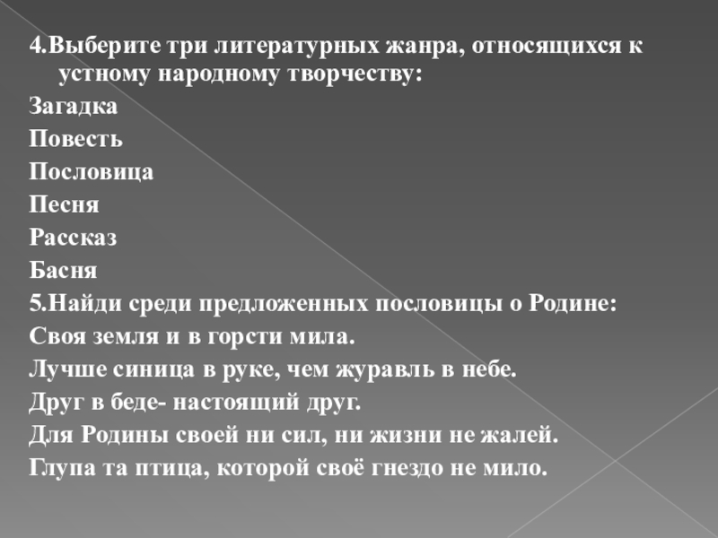 Слайд 344.Выберите три литературных жанра, относящихся к устному народному творчеству: