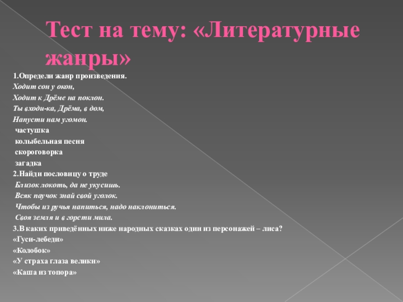 Слайд 37Тест на тему: «Литературные жанры»