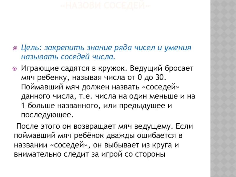 садятся в кружок. Ведущий бросает мяч ребенку, называя числа от 0 до 30. Поймавший мяч должен назвать «соседей» данного числа, т.е. числа на один меньше и на 1 больше названного, или предыдущее и последующее.