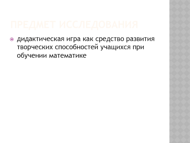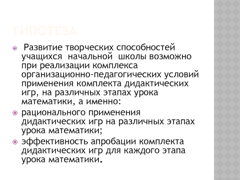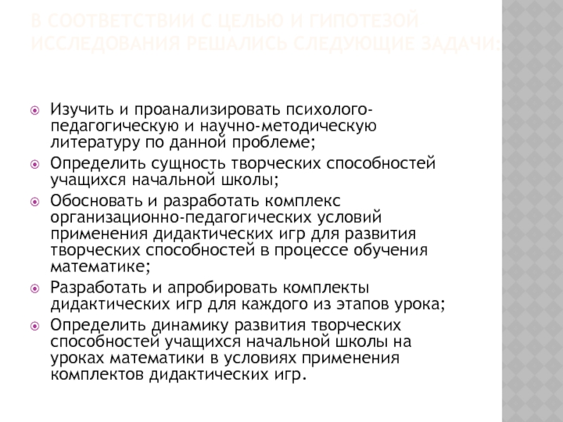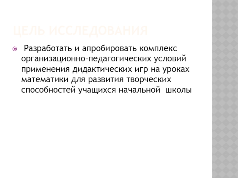 Обосновать и разработать комплекс организационно-педагогических условий применения дидактических игр для развития творческих способностей в процессе обучения математике;