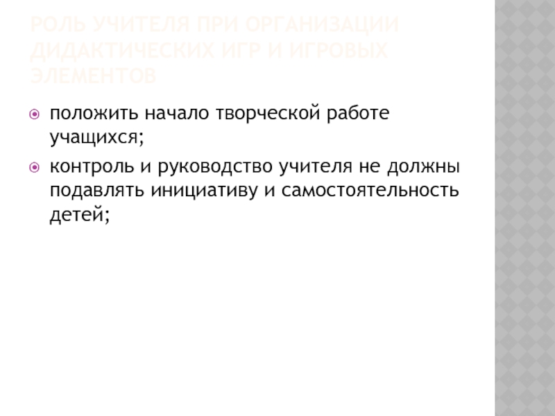 Слайд 12Роль учителя при организации дидактических игр и игровых элементов
