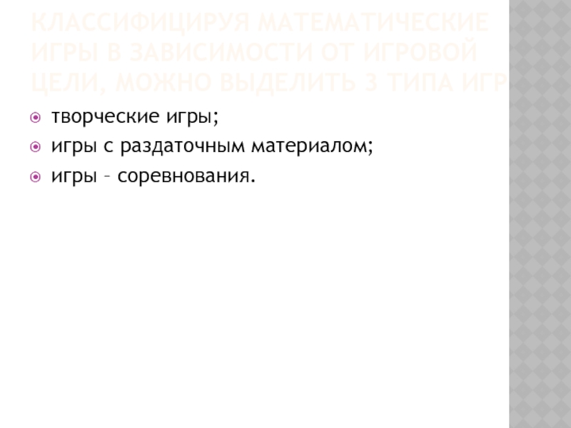 Слайд 13Классифицируя математические игры в зависимости от игровой цели, можно выделить 3