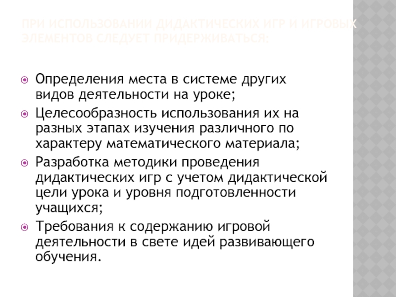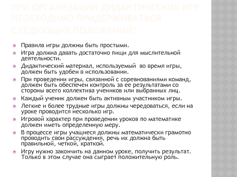 Слайд 10При использовании дидактических игр и игровых элементов следует придерживаться: