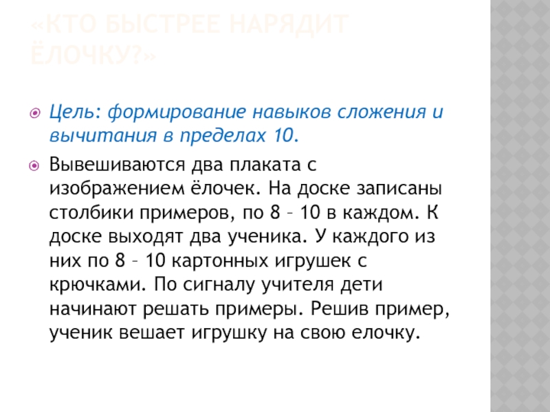 Вывешиваются два плаката с изображением ёлочек. На доске записаны столбики примеров, по 8 – 10 в каждом. К доске выходят два ученика. У каждого из них по 8 – 10 картонных игрушек с крючками. По сигналу учителя дети начинают решать примеры. Решив пример, ученик вешает игрушку на свою елочку.