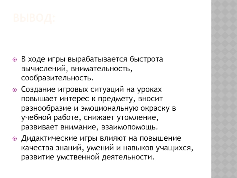 Дидактические игры влияют на повышение качества знаний, умений и навыков учащихся, развитие умственной деятельности.