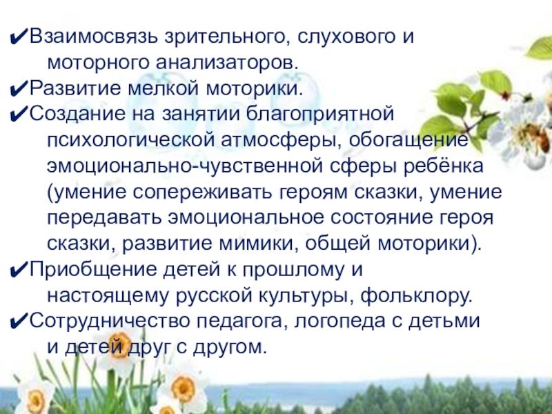 нарушений, личностное развитие ребенка и сохранение его здоровья, и позволяет в рамках сказки решать обучающие, коррекционные,