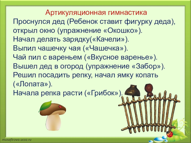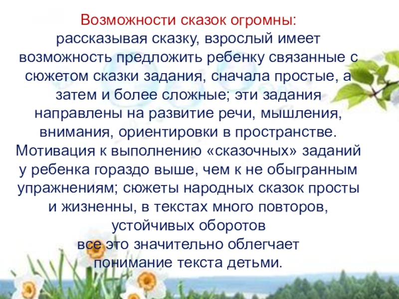 сюжетом сказки задания, сначала простые, а затем и более сложные; эти задания направлены на развитие речи, мышления, внимания, ориентировки в пространстве. Мотивация к выполнению «сказочных» заданий у ребенка гораздо выше, чем к не обыгранным упражнениям; сюжеты народных сказок просты и жизненны, в текстах много повторов, устойчивых оборотов