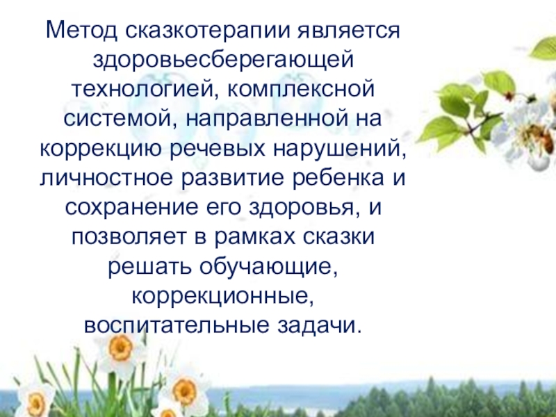 Слайд 24Метод сказкотерапии является здоровьесберегающей технологией, комплексной системой, направленной на коррекцию речевых