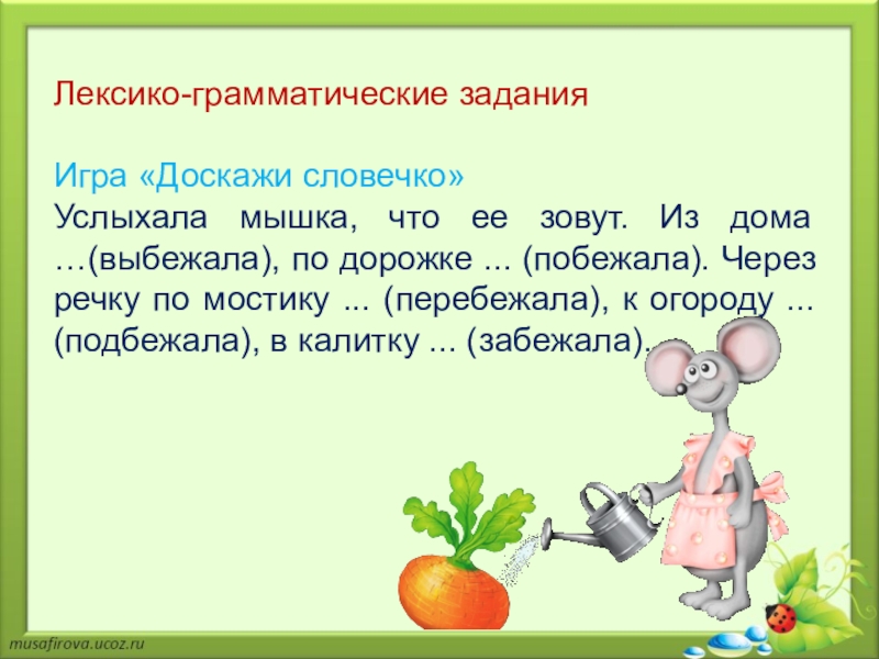 дома …(выбежала), по дорожке ... (побежала). Через речку по мостику ... (перебежала), к огороду ... (подбежала), в калитку ... (забежала).