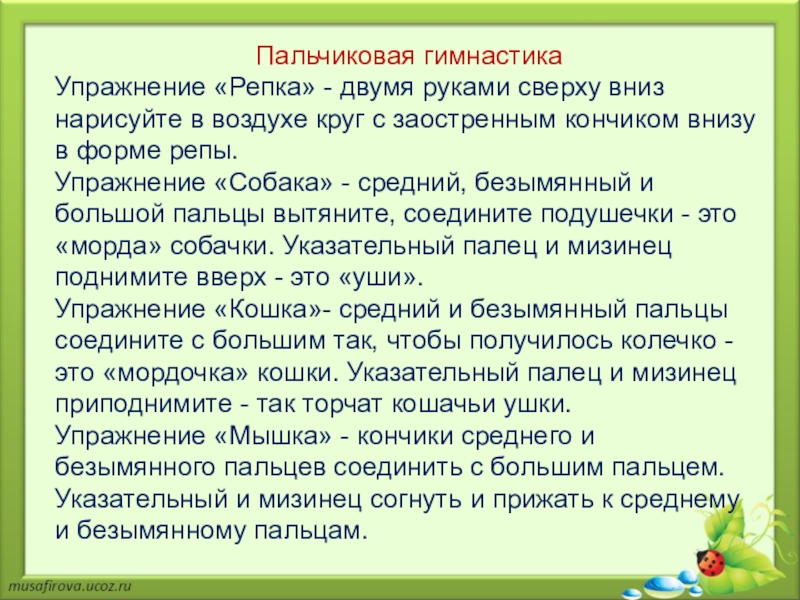 Упражнение «Мышка» - кончики среднего и безымянного пальцев соединить с большим пальцем. Указательный и мизинец согнуть и прижать к среднему