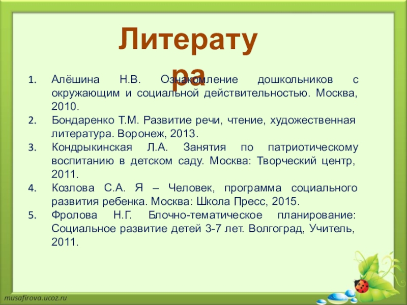 Алёшина Н.В. Ознакомление дошкольников с окружающим и социальной действительностью. Москва, 2010.