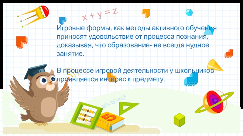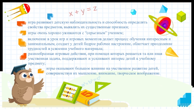 разнообразные игровые действия, при помощи которых решается та или иная умственная задача, поддерживают и усиливают интерес детей к учебному предмету;
