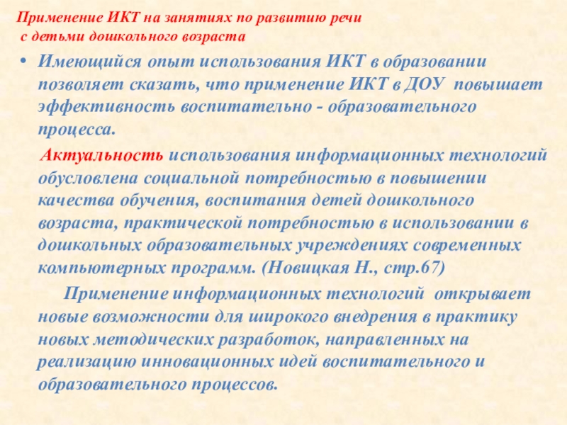 Актуальность использования информационных технологий обусловлена социальной потребностью в повышении качества обучения, воспитания детей дошкольного возраста, практической потребностью в использовании в дошкольных образовательных учреждениях современных компьютерных программ. (Новицкая Н., стр.67)
