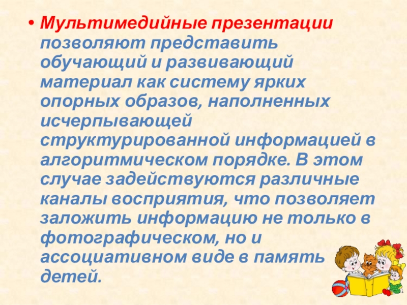 опорных образов, наполненных исчерпывающей структурированной информацией в алгоритмическом порядке. В этом случае задействуются различные каналы восприятия, что позволяет заложить информацию не только в фотографическом, но и ассоциативном виде в память детей.