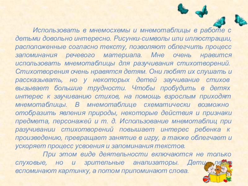 и мнемотаблицы в работе с детьми довольно интересно. Рисунки-символы или иллюстрации, расположенные согласно тексту, позволяют облегчить процесс запоминания речевого материала. Мне очень нравится использовать мнемотаблицы для разучивания стихотворений. Стихотворения очень нравятся детям. Они любят их слушать и рассказывать, но у некоторых детей заучивание стихов вызывает большие трудности. Чтобы пробудить в детях интерес к заучиванию стихов, на помощь взрослым приходят мнемотаблицы. В мнемотаблице схематически возможно отобразить явления природы, некоторые действия и признаки предмета, персонажей и т. д. Использование мнемотаблиц при разучивании стихотворений повышает интерес ребенка к произведению, превращает занятие в игру, а также облегчает и ускоряет процесс усвоения и запоминания текстов.
